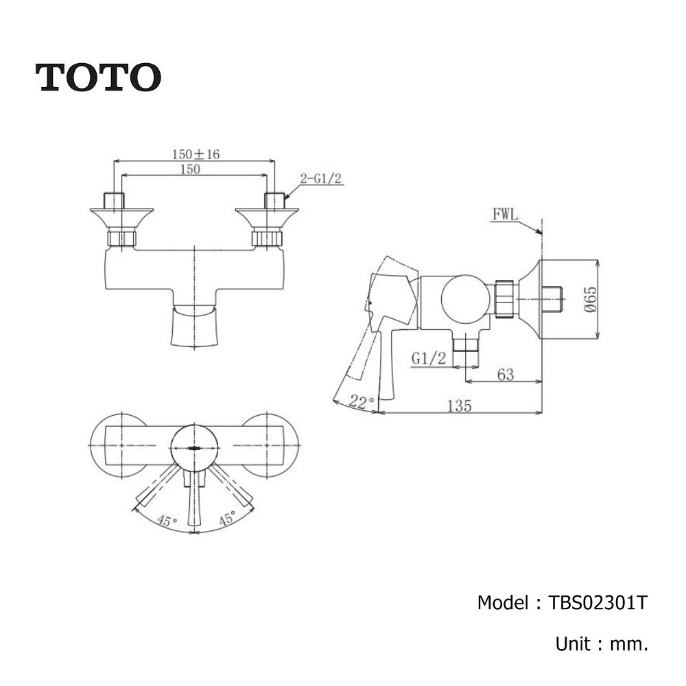 TBS02301T ก๊อกผสมสำหรับยืนอาบน้ำ ชนิดติดผนัง (ไม่รวมชุดฝักบัวสายอ่อน)